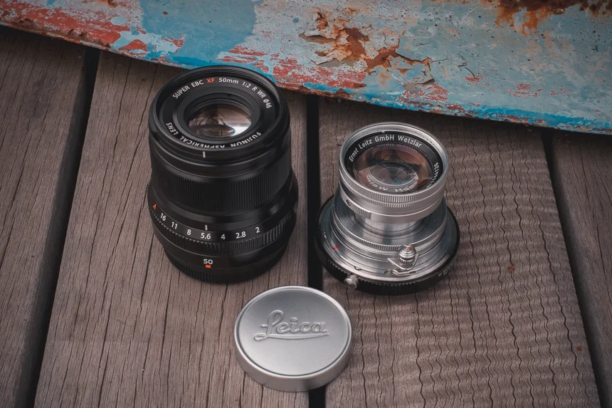 Summicron 5cm F2 LTM was made in 1950s. Also, Modern Fujinon XF 50mm F2R WR has same spec. It is very interesting in the difference between these two lenses.